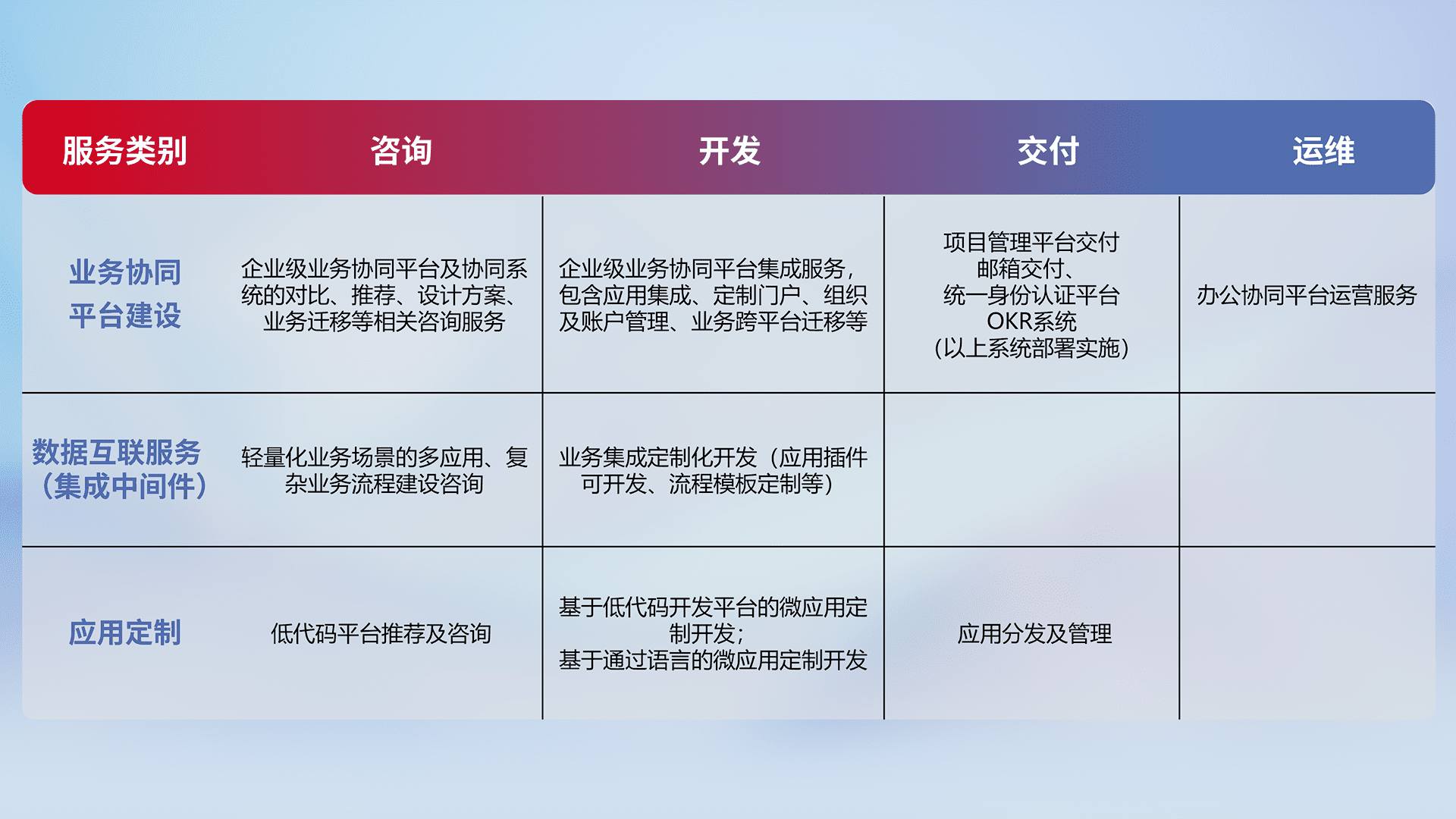 针对钉钉、、、企微、、、IDaas等平台级产品提供产品的规划、、、方案、、、、交付、、、定制化开发等服务,,,,实现如统一协同办公、、、、智能客户服务、、、、混合会议管理、、、智能数据查询、、、、等业务场景,,实现数字化转型。。