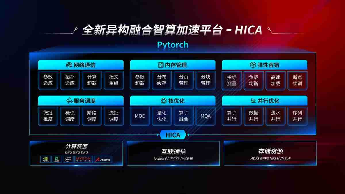 通过自研的服务层、、中间适配层、、以及调度编排算法,,采用数据并行、、模型并行等多种并行方式,,,,把并行计算任务进行有效的分解,,使其分别由相应的软件栈和算力资源来承接。。。。当GPU资源变化,,HICA可以实时动态调度计算子任务并调整模型拓扑和架构,,,以充分聚合各种算力资源。。