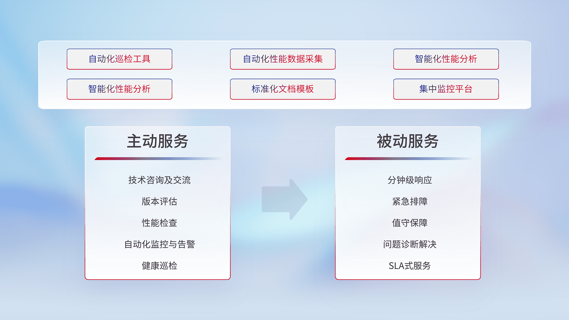 智能化工具和标准化文档,,,保障服务质量,,,,提供主动服务(包含技术咨询、、、版本评估、、、、性能检查、、自动化监控与告警、、、健康巡检)和被动服务包含(分钟级响应、、、、紧急排障、、值守保障、、、、问题诊断解决、、、SLA服务)。。。