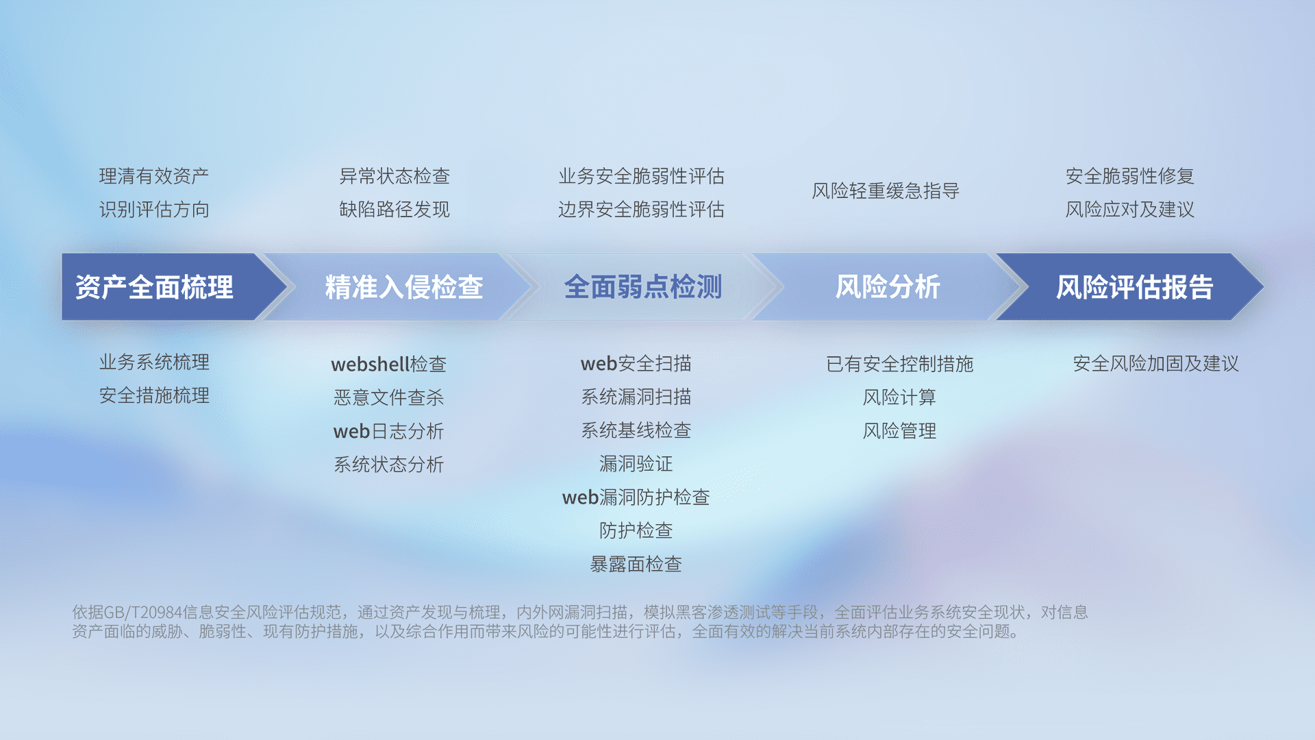 针对客户行业特性,,以专业的安全服务+多厂商联合解决方案提供专属的一站式安全管理服务,,帮助客户全面感知网络空间威胁,,,,基于识别、、、、检测、、、、分析、、、、防护、、、监测、、响应的服务理论模型,,,从方案咨询、、、集成交付、、评估验证、、、优化加固、、、运维运营,,,致力于为客户提供完整的闭环管理式安全服务。。。。以实战经验为客户打造高抵御风险的安全体系,,,帮助客户发现威胁、、、对抗威胁、、、处置威胁,,,,不断积累安全对抗能力,,,,持续保障数字化安全。。。